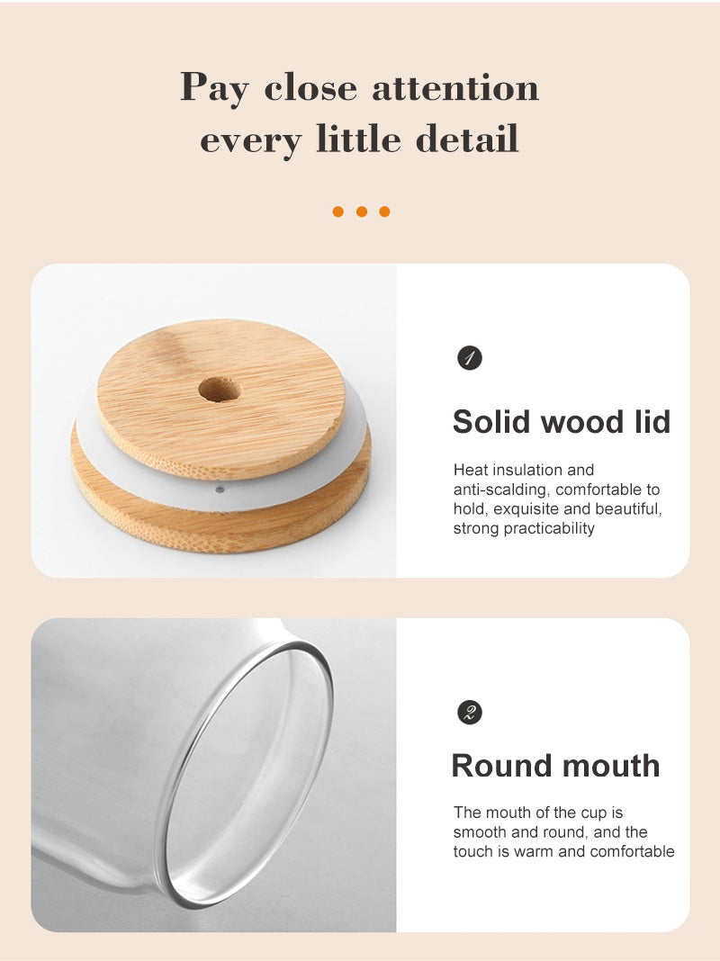 This 550ML can glass with a wooden lid and transparent bent glass straw is perfect for enjoying your favorite beverages on the go. Made with high-quality materials, this glass provides a unique and stylish way to hydrate while being environmentally friendly. Say goodbye to plastic straws and hello to a sustainable solution.